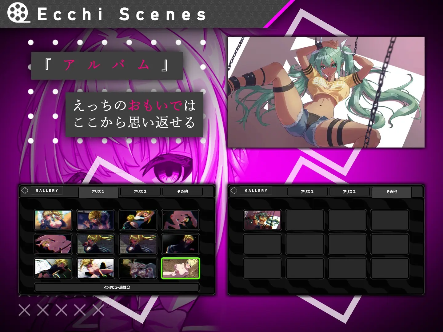 在主线剧情中解锁的成人事件可在标题界面的【画廊(GALLERY)】中查看。
