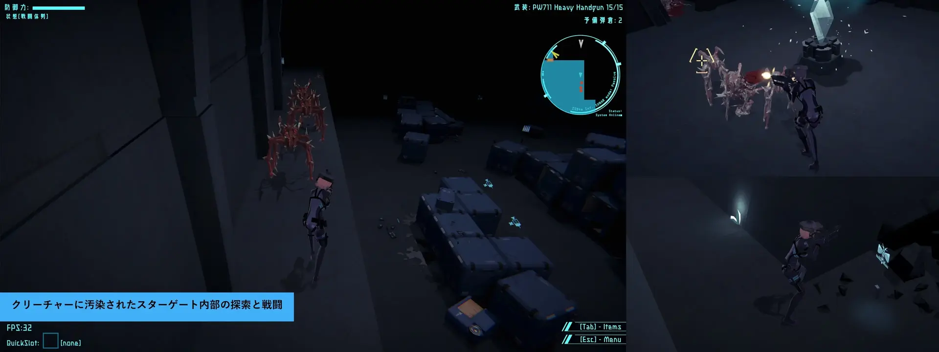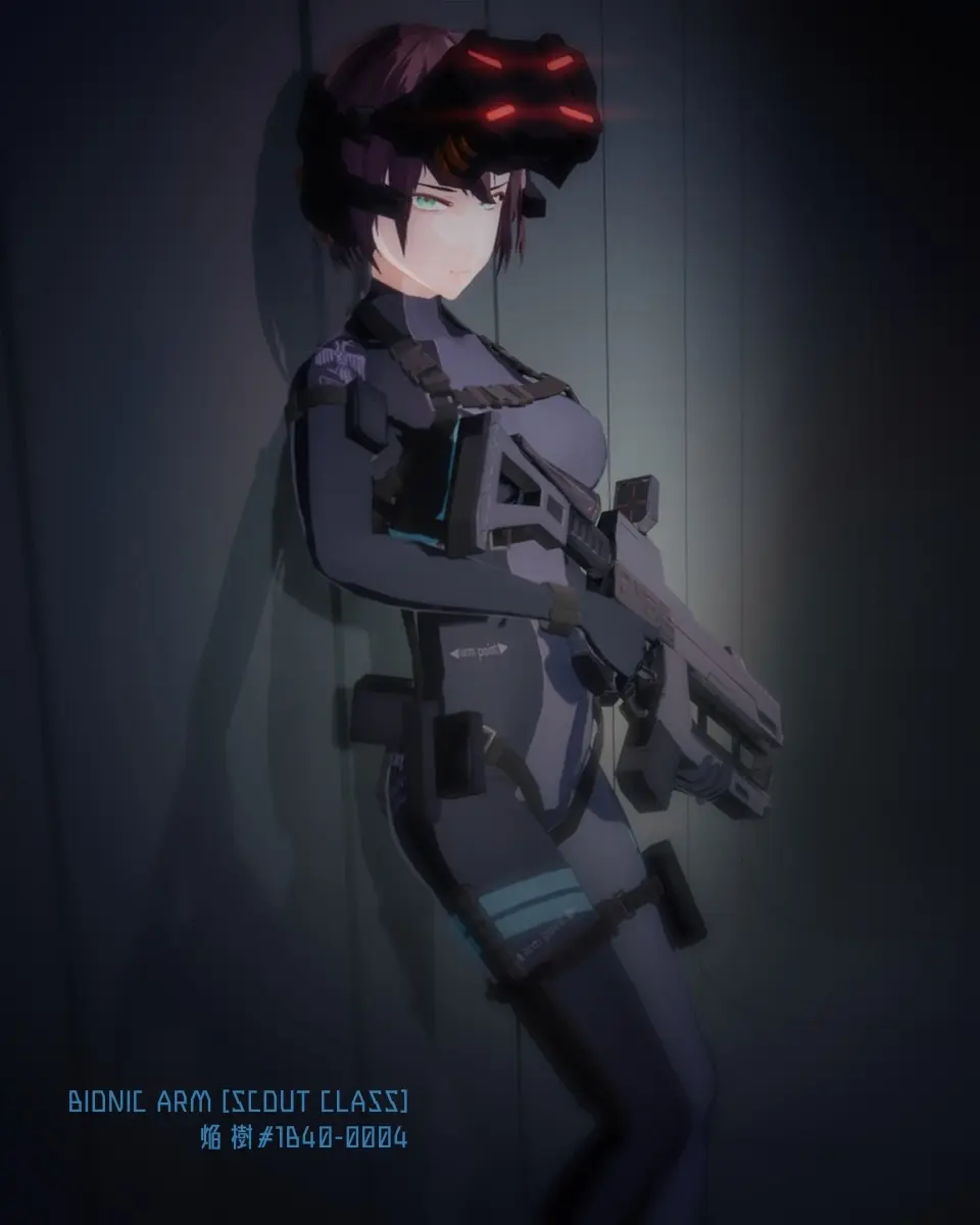 紧身衣+护具装备的女主角在俯视角的科幻射击/动作游戏中战斗。