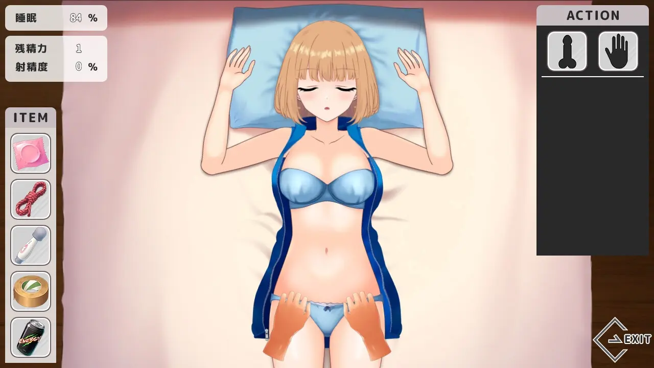 这是一款对睡着的女孩子进行色情恶作剧的游戏。每次恶作剧,女孩子当然会逐渐进入觉醒状态,请小心操作,尽量不吵醒她,直到最后完成游戏。