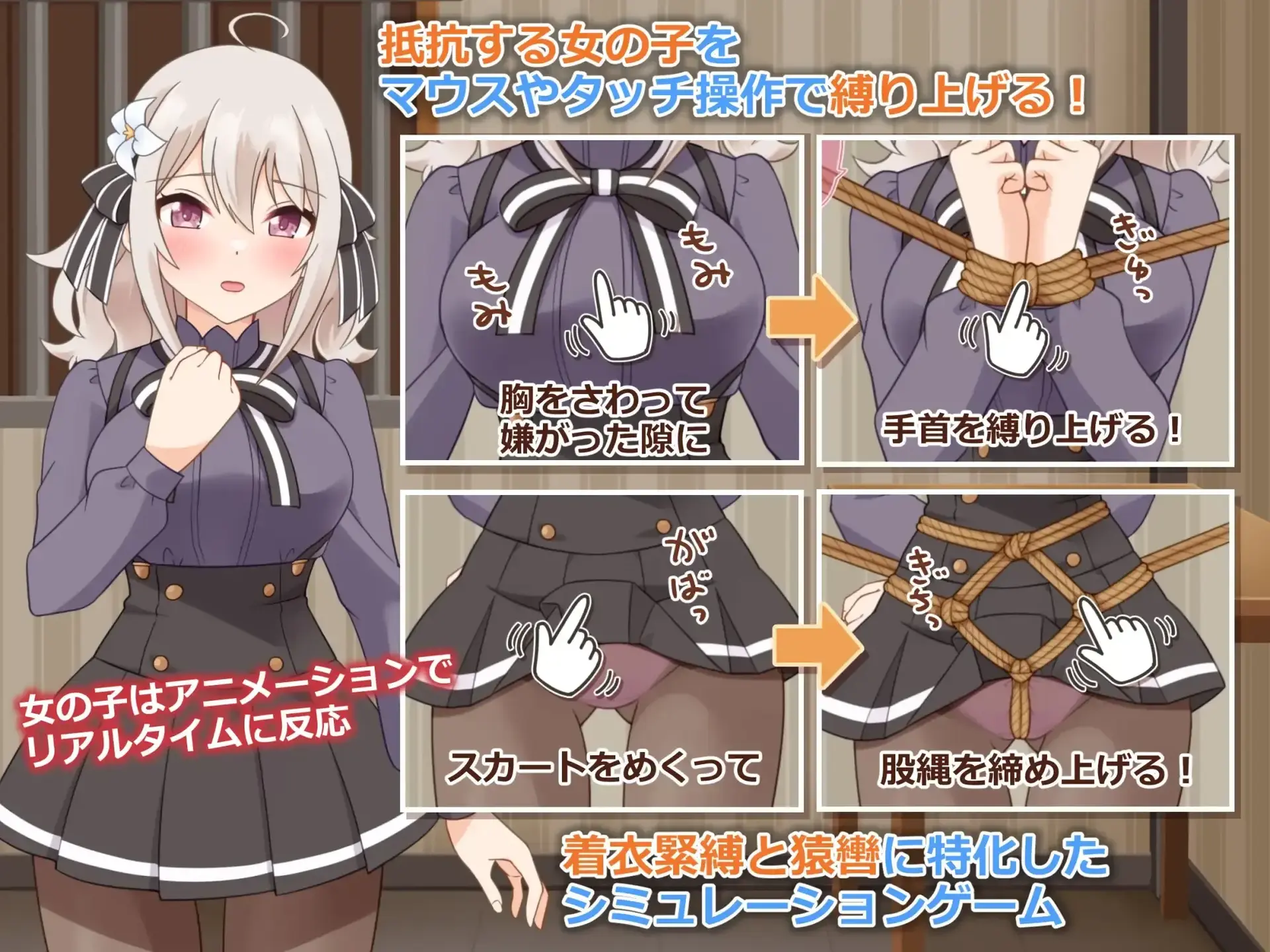 本作是一款通过动画呈现实时反应的模拟游戏,玩家可绑缚女孩并享受她们的反应。