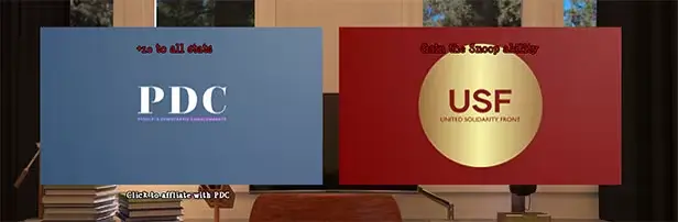 主角开始工作后,可以选择公司所属的政治派别。PDC 会提升他的属性,这有助于提升与其他角色的好感度,并影响他人。选择 USF 则会获得“窥探”能力。他可以通过物理或技术手段监视他人。这两种选择都适用于任何游戏风格,但如果你想要完整的 NTR(嫉妒诱导)体验,USF 可能是更好的选择。