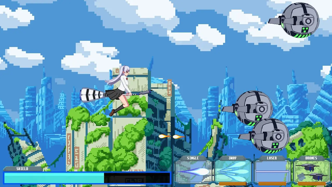 游戏中有四种武器:单发、三向射击、激光和无人机,使用它们需要消耗能量。
