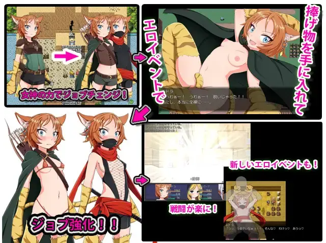三人因为与女神的契约获得了切换职业的能力。把H事件里收集到的「供品」献上就能强化职业,但每强化一次,衣服的暴露度就会上升。