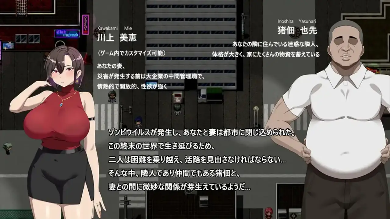 主要故事中,与妻子和邻居猪佃组成探险队,在安全区域外探索。在危险的末日都市中,努力完成任务,保护妻子。