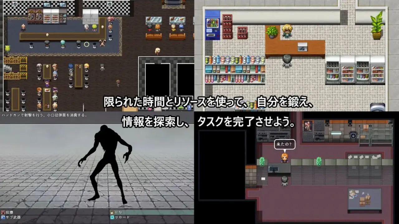 开放世界型的构造,分为白天、夜晚、深夜3个时间段。玩家可以在该时间段内自由行动,进行寻找食物、赚钱、提高能力值等任务。你必须在有限的天数内完成主要任务,与妻子一起发现真相并逃离安全区。