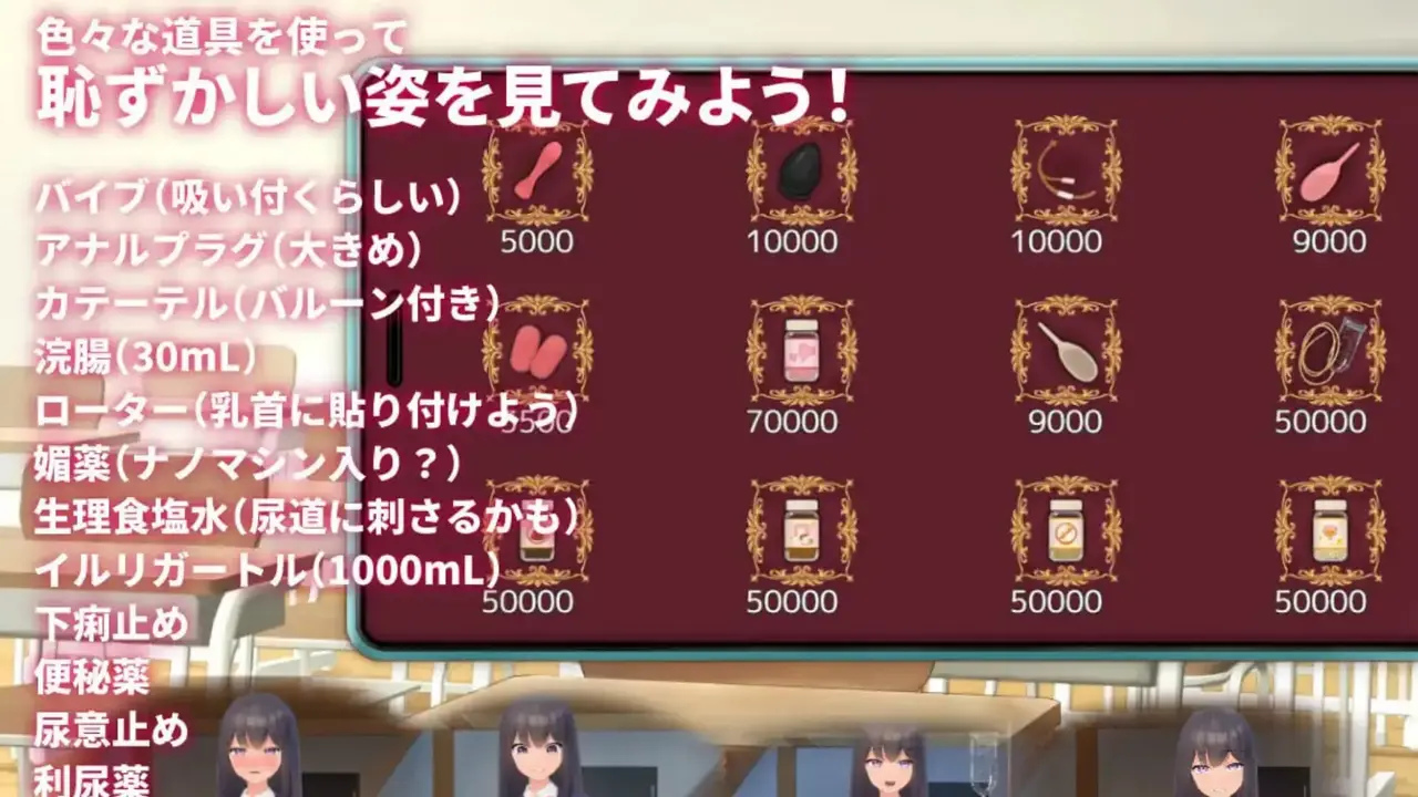 这是一款模拟游戏,您可以为女孩装配各种特殊道具,如振动器、肛塞、灌肠器或导尿管等,并享受她们的反应。