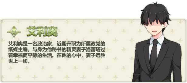 主角“埃利奥”(Elio)与他的精灵妻子“洛蕾塔”(Loretta)过着幸福的婚姻生活。
