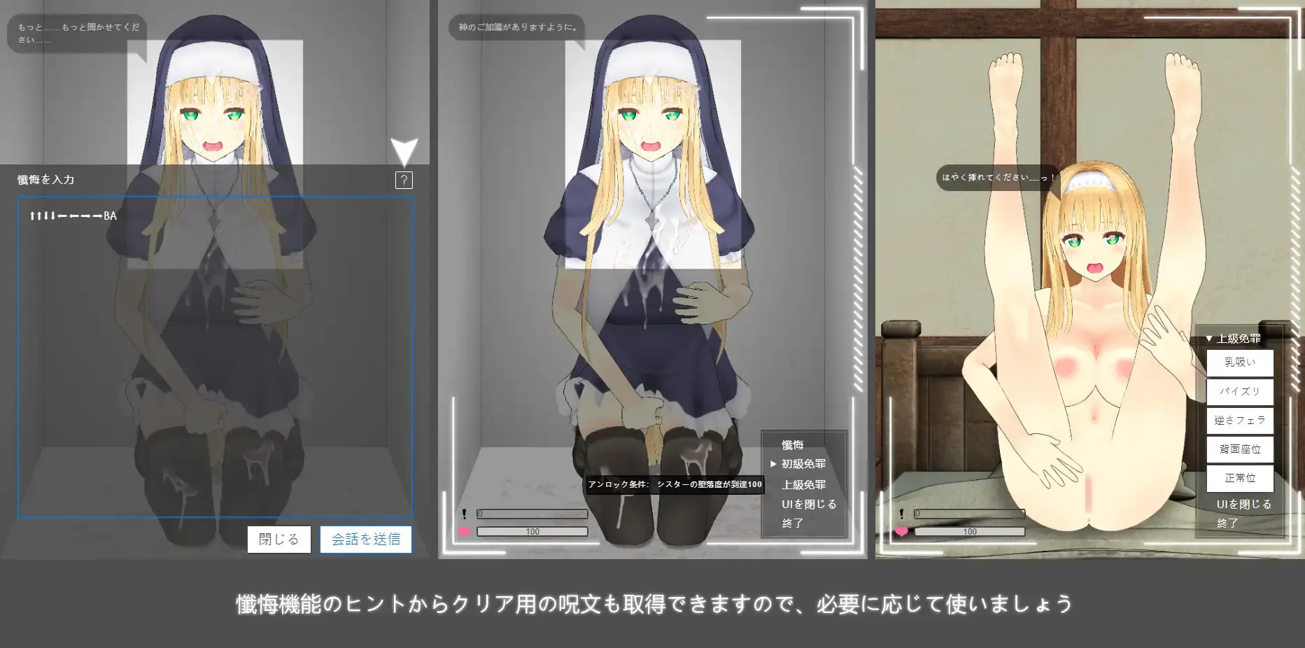 你是否有不可告人的秘密,或是无法诉说的罪孽?快来使用告解功能,向姐姐诉说你单恋的感情,净化你饱受折磨的心灵吧!