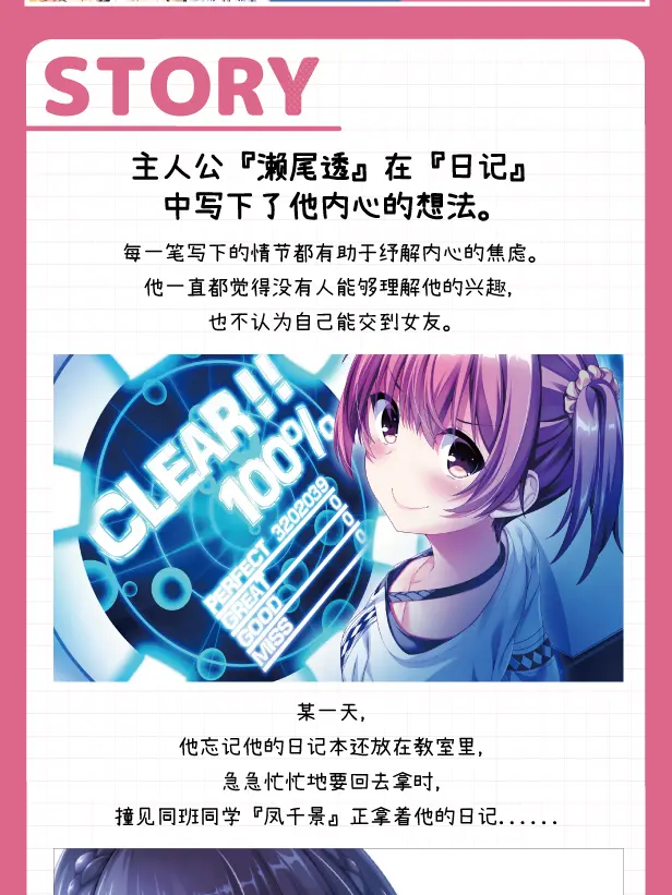 爱做白日梦的主人公常常写下一些邪恶的想法在日记里,某天不小心被发现后,班上的新同学或是老同学都开始围着他转。荣获2020年萌系游戏金奖,吸引人的画面还有精致的动画,更重要的是还有多位以他为重的女主角们。精彩的游戏甚至改编成了动画。